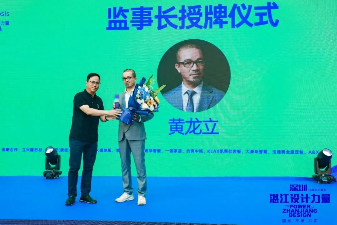 湛江設(shè)計(jì)力量總會(huì)監(jiān)事長(zhǎng)李光熙為深圳湛江設(shè)計(jì)力量監(jiān)事長(zhǎng)黃龍立授牌