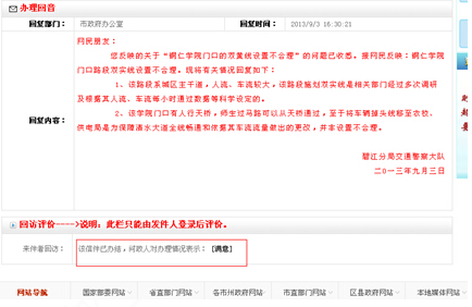 ?。?)重監(jiān)督。對(duì)超過(guò)規(guī)定時(shí)限未辦結(jié)的來(lái)信,問(wèn)政人或公眾可在線要求承辦單位致歉,承辦單位必須在2個(gè)工作日內(nèi)進(jìn)行書面道歉,說(shuō)明超期未辦結(jié)原因,作出辦結(jié)時(shí)限承諾。
