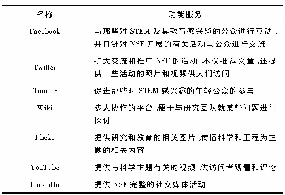 社交媒體是人們彼此之間分享意見和觀點的工具和平臺,現(xiàn)階段的社交媒體主要包括各種社交網(wǎng)站、微博、微信、博客、論壇等。利用社交媒體技術(shù)可以推動政府與公眾的對話,并為社會各方討論政府政策制定和實施提供機會,促進官民合作。以白宮的“we the people”請愿網(wǎng)為例,該平臺為公眾聯(lián)合發(fā)起政策議題、參與聯(lián)邦政府政策的制定提供了重要途徑。美國國家科學(xué)基金會(The National Science Foundation,NSF)為促進公眾參與的多元化,加強政府與公眾的溝通協(xié)作,構(gòu)建了多種社交媒體網(wǎng)站(見表2)。這些社交媒體工具極大地促進了公眾的參與。