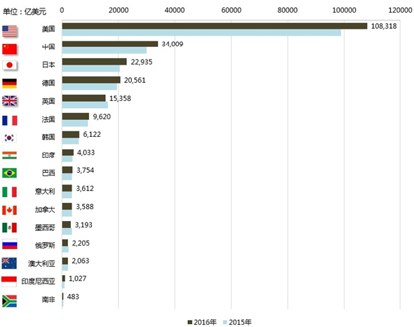 圖4 2015-2016年G20數(shù)字經(jīng)濟規(guī)模