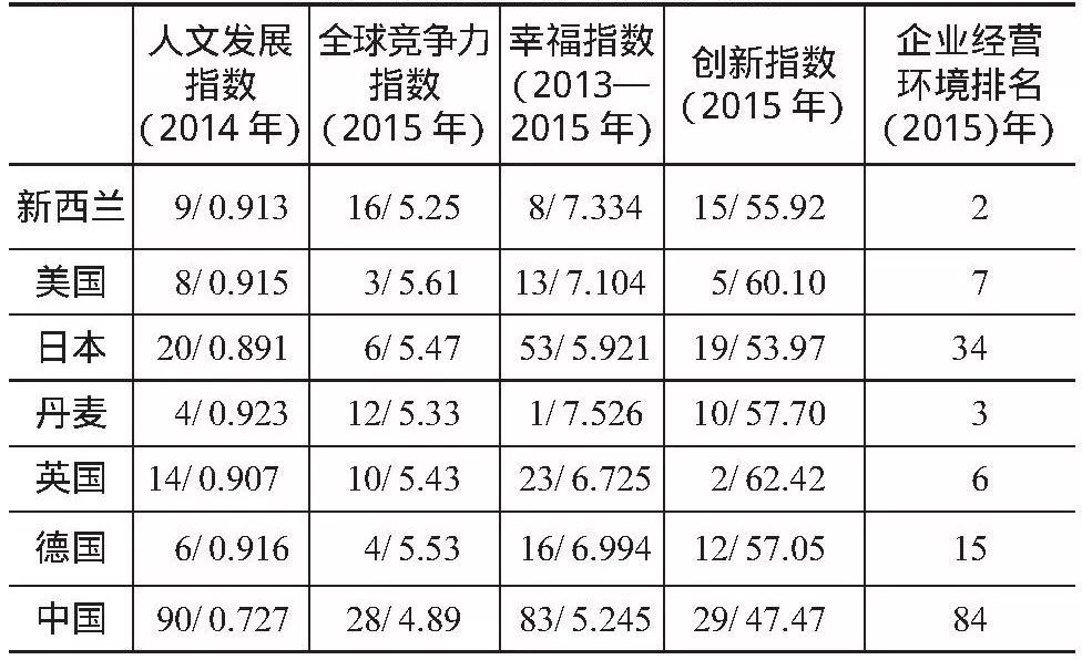 一個(gè)國(guó)家要真正走向現(xiàn)代化, 必須實(shí)現(xiàn)經(jīng)濟(jì)、社會(huì)、政治、民生等方面的協(xié)調(diào)現(xiàn)代化。因而, 一個(gè)國(guó)家各方面的經(jīng)濟(jì)社會(huì)發(fā)展指數(shù)之間必須相互均衡、相互匹配。在這些指數(shù)中, 人文發(fā)展指數(shù)、全球競(jìng)爭(zhēng)力指數(shù)、幸福指數(shù)、創(chuàng)新指標(biāo)和企業(yè)經(jīng)營(yíng)環(huán)境等五個(gè)重要指數(shù)之間必須均衡。如表2所示, 美國(guó)的各個(gè)重要發(fā)展指數(shù)之間基本均衡, 美國(guó)人文發(fā)展指數(shù)2014年為0.915, 排名第8位;全球競(jìng)爭(zhēng)力指數(shù)2015年為5.61, 排名第3位;幸福指數(shù)2013—2015年為7.104, 排名第13位, 創(chuàng)新指數(shù)2015年為60.10, 排名第5位, 企業(yè)經(jīng)營(yíng)環(huán)境排名第2位。而我國(guó)人文發(fā)展指數(shù)2014年為0.727, 排名第90位, 全球競(jìng)爭(zhēng)力指數(shù)2015年為4.89, 排名第28位;幸福指數(shù)2013—2015年為5.245, 排名第83位, 創(chuàng)新指數(shù)2015年為47.47, 排名第29位, 企業(yè)經(jīng)營(yíng)環(huán)境排名第84位138, 346-377。顯然, 我國(guó)人文發(fā)展指數(shù)、幸福指數(shù)、企業(yè)經(jīng)營(yíng)環(huán)境指數(shù)全球排名均在75位之后, 大幅度低于我國(guó)全球競(jìng)爭(zhēng)力指數(shù)、創(chuàng)新指數(shù)的全球排名。這既說(shuō)明我國(guó)各經(jīng)濟(jì)社會(huì)發(fā)展指數(shù)之間的嚴(yán)重不均衡, 也說(shuō)明我國(guó)進(jìn)一步深化放管服改革, 進(jìn)一步提升企業(yè)經(jīng)營(yíng)環(huán)境、幸福指數(shù)、人文發(fā)展指數(shù)的極端重要性。