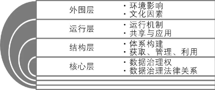 外圍層:互聯(lián)網(wǎng)時代政府數(shù)據(jù)治理系統(tǒng)的外部環(huán)境和文化因素對政府治理的影響, 營造符合數(shù)據(jù)治理文化的外部支撐環(huán)境。