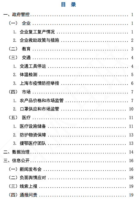 摘要:新型冠狀病毒感染的肺炎疫情發(fā)生以來,上海市按照黨中央、國務(wù)院的決策部署,在市新型冠狀病毒感染的肺炎疫情防控工作領(lǐng)導小組統(tǒng)一指揮下,出臺了一系列防控法規(guī)、政策和舉措。本報告采集上海市及其下轄16區(qū)的防控疫情相關(guān)數(shù)據(jù),從政府管控、數(shù)據(jù)治理、信息公開三個維度進行數(shù)據(jù)采集、分析,總體來看上海市與16個市轄區(qū)政府在企業(yè)、教育、交通、市場等領(lǐng)域均開展了相關(guān)防疫的工作措施,通過市政務(wù)服務(wù)平臺、官方App、微信公眾號等渠道快速搭建了相關(guān)疫情服務(wù)平臺,提供疫情信息發(fā)布、疫情線索申報、醫(yī)療服務(wù)、同行程人員查詢、口罩預(yù)約等服務(wù),同時各級政府也通過新聞發(fā)布會等及時進行疫情通報、防護知識普及與辟謠。而新技術(shù)的應(yīng)用在此次疫情防控中也各顯其能,助力研判分析疫情,加強疫情聯(lián)防聯(lián)控,保證經(jīng)濟恢復高效運行。