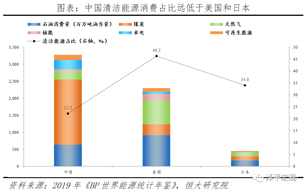 在清潔能源消費(fèi)比例方面,根據(jù)2019年《BP世界能源統(tǒng)計(jì)年鑒》,2018年中國能源消費(fèi)中煤炭、石油、天然氣、水電、核能、可再生能源分別占比58.2%、19.6%、7.4%、8.3%、2.0%和4.4%,清潔能源合計(jì)占22.1%;而美國分別占比13.8%、40.0%、30.5%、2.8%、8.4%和4.5%,清潔能源占46.2%;日本分別占比25.9%、40.2%、21.9%、4.0%、2.4%和5.6%,清潔能源占34.0%。