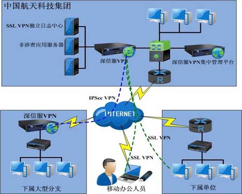 在中國航天科技集團在總部部署一臺深信服SSL/IPSec 二合一VPN同時提供IPSec VPN組網(wǎng)以及SSL VPN接入兩種功能。對于數(shù)據(jù)量較大的大型分支采用IPSec VPN接入,其余分支則通過SSL VPN實現(xiàn)安全接入。