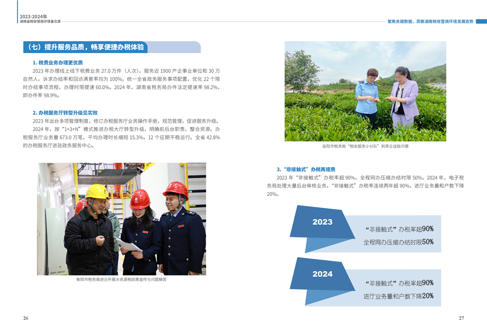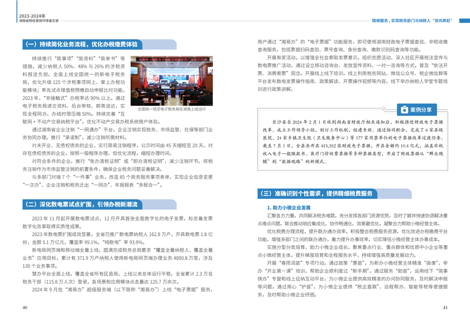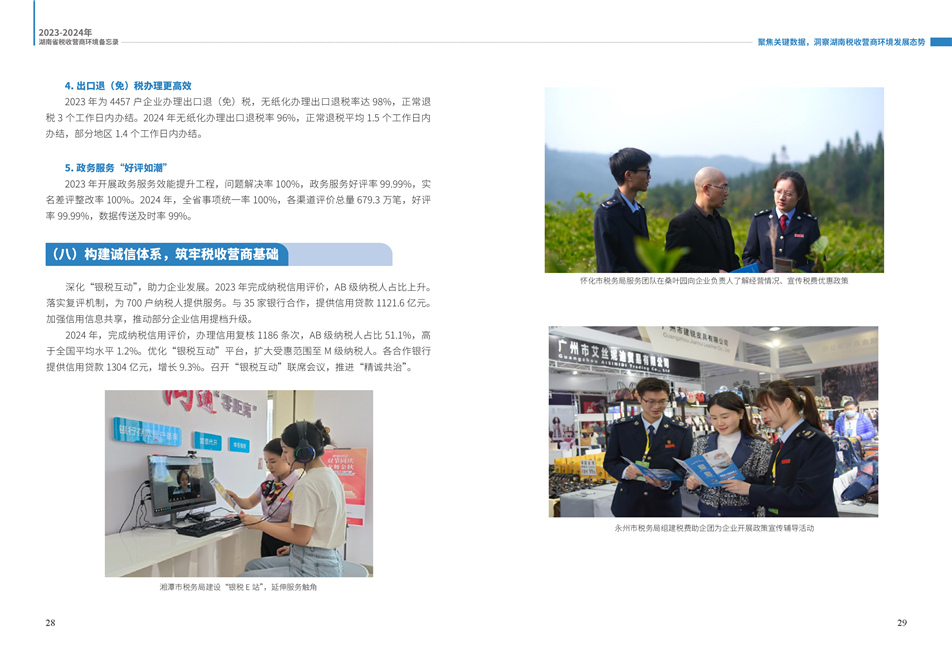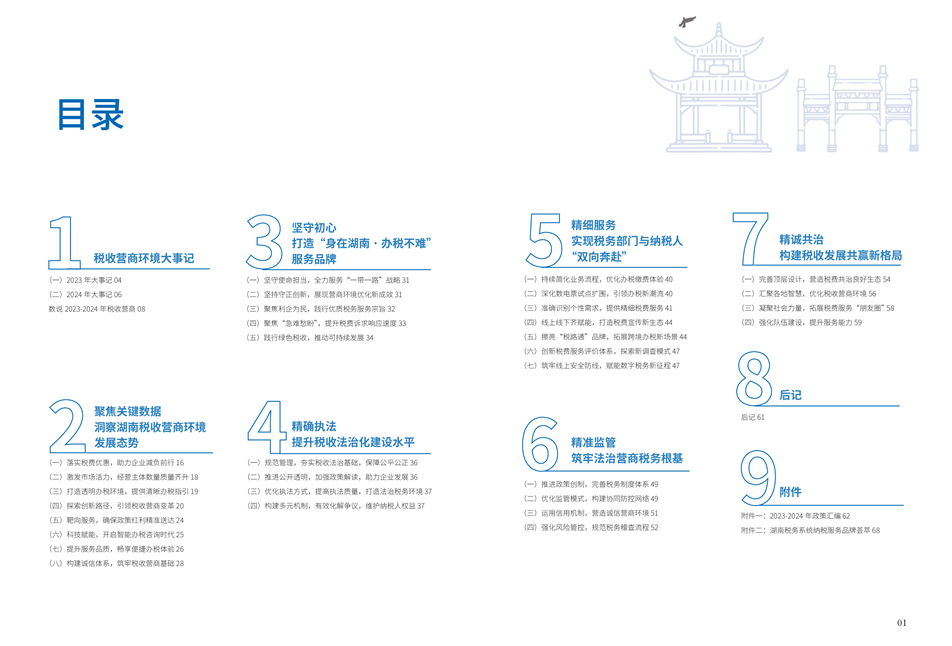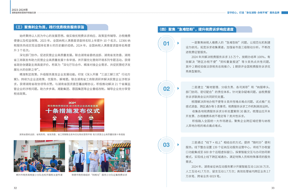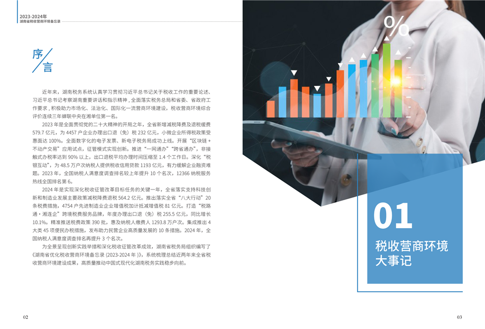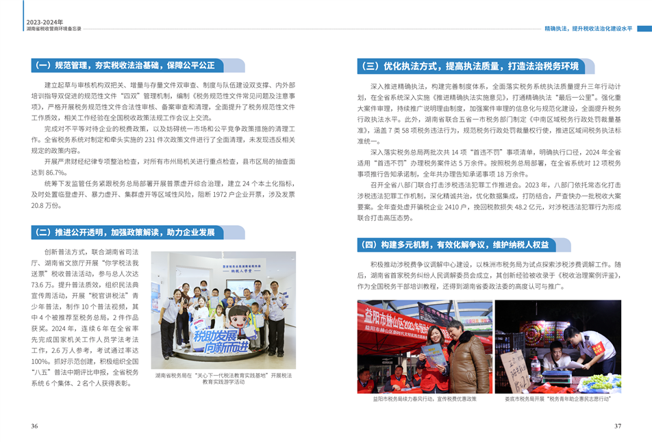 為更好展示湖南稅務(wù)部門在優(yōu)化營(yíng)商環(huán)境工作中的創(chuàng)新舉措和改革成效,湖南省稅務(wù)局組織編寫了《2023—2024年湖南省稅收營(yíng)商環(huán)境備忘錄》。全書共分為9個(gè)篇章,以“四個(gè)聚焦”鋪展呈現(xiàn):
