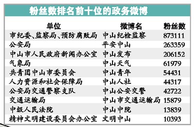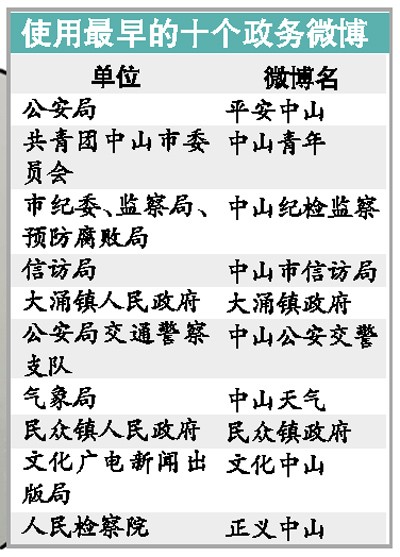 目前全市的24個鎮(zhèn)區(qū)的官方微博已全面上線,而市政府直屬的34個部門中,除中山市人民政府辦公室外,還有市財政局、市公安消防局、市體育局、市審計局、市公路局、市統(tǒng)計局等6個部門沒有官方微博上線。
