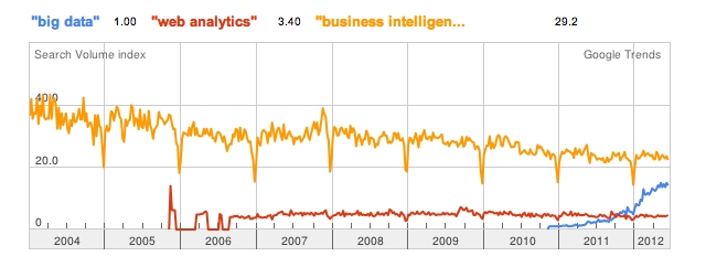 如下圖所示,谷歌趨勢(shì)顯示,與“網(wǎng)站分析”(web analytics)和”商業(yè)智能”(business intelligence)較為平穩(wěn)的搜索曲線相比,“大數(shù)據(jù)”(big data)的搜索量迎來(lái)了火箭式的大幅度增長(zhǎng)。