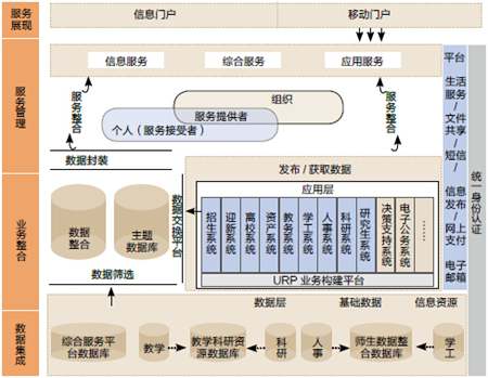 在業(yè)務(wù)流程層面,復(fù)旦大學(xué)針對用戶在校管理服務(wù)的生命周期,做了本科生、研究生、教職工的生命周期的業(yè)務(wù)梳理,優(yōu)化管理環(huán)節(jié),以“一站式”服務(wù)的形式規(guī)劃了若干業(yè)務(wù)場景,包括將同質(zhì)化服務(wù)進(jìn)行歸并,如成績單、在職證明、戶籍證明等各類公證證明的打印,合并辦理本科生與研究生的獎(jiǎng)、勤、助、貸、補(bǔ)的申請與發(fā)放;按業(yè)務(wù)特定人群劃分服務(wù)群,如出國出境事務(wù)、迎新、就業(yè)、離校等服務(wù)的集中辦理等。對歸并后的服務(wù)基于底層數(shù)據(jù)進(jìn)行整合,根據(jù)屬性信息分發(fā)到不同業(yè)務(wù)系統(tǒng)、不同環(huán)節(jié)中進(jìn)行后續(xù)管理實(shí)現(xiàn)流程的優(yōu)化,其重點(diǎn)是簡化個(gè)人的工作,改善部門間的協(xié)同方式。在數(shù)據(jù)整合層面的設(shè)計(jì)中,面對異構(gòu)的數(shù)據(jù)源,通過ETL抽取、數(shù)據(jù)同步、跨庫視圖、數(shù)據(jù)導(dǎo)入等數(shù)據(jù)同步機(jī)制將數(shù)據(jù)以統(tǒng)一的標(biāo)準(zhǔn)和表結(jié)構(gòu)進(jìn)行重組,適應(yīng)業(yè)務(wù)協(xié)作流程的需要。