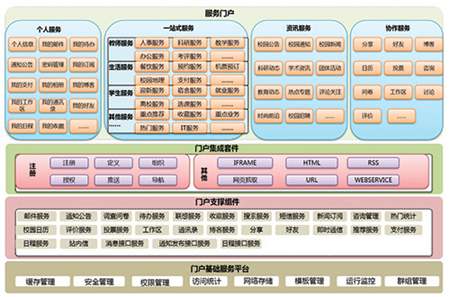 建設(shè)信息化“一站式”服務(wù)中心,需要對服務(wù)的屬性進(jìn)行統(tǒng)一的規(guī)劃,所有服務(wù)有規(guī)范的接入標(biāo)準(zhǔn),在服務(wù)中心進(jìn)行統(tǒng)一的注冊和管理。復(fù)旦大學(xué)在服務(wù)組件的設(shè)計(jì)上注重標(biāo)準(zhǔn)化、組件化、層次化和平臺化,將大大小小的業(yè)務(wù)職能和支撐功能抽象成不同層次的服務(wù),每項(xiàng)服務(wù)無論粒度粗細(xì)都封裝了一定的業(yè)務(wù)邏輯,對外暴露的僅是數(shù)據(jù)的輸入和效果的輸出,這種封裝方式使得服務(wù)的新增、升級、替換都相對簡單,服務(wù)模塊的利用率和易用性都很高,管理簡單易行。門戶支撐組件為“一站式”服務(wù)提供了標(biāo)準(zhǔn)的公共服務(wù)平臺接口。