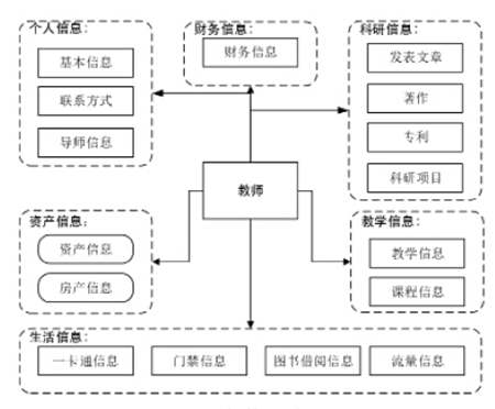 在方案設(shè)計(jì)中,個(gè)人數(shù)據(jù)中心按照用戶角色分為教師數(shù)據(jù)中心和學(xué)生數(shù)據(jù)中心。教師數(shù)據(jù)中心包括個(gè)人基本信息、科研信息、資產(chǎn)信息、教學(xué)信息、生活信息等,如圖3所示。
