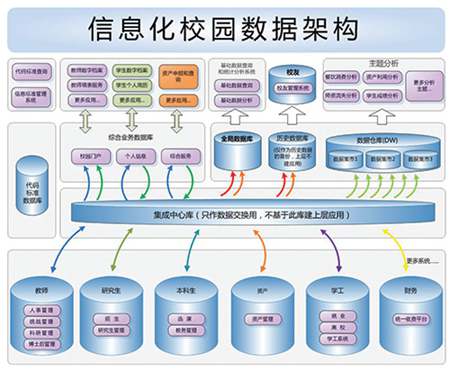 數(shù)據(jù)集成的作用是為整個(gè)“一站式”服務(wù)框架建立基礎(chǔ)的、權(quán)威的數(shù)據(jù)源。數(shù)據(jù)集成依托信息化校園數(shù)據(jù)中心,采用數(shù)據(jù)交換工具,將運(yùn)行過程中逐步積累的數(shù)據(jù)整合、抽取和同步置入綜合服務(wù)數(shù)據(jù)庫,并通過數(shù)據(jù)篩選、轉(zhuǎn)換,將來源于業(yè)務(wù)系統(tǒng)的數(shù)據(jù)按業(yè)務(wù)流程或職能分工組織改變?yōu)橐匀恕⒇?cái)、物等主題組織,形成完整、獨(dú)立的主題數(shù)據(jù)庫,讓師生能夠方便地使用與自己相關(guān)的個(gè)人綜合業(yè)務(wù),讓院系能夠方便地查詢自己部門的人事、教學(xué)、科研等綜合情況,并為跨部門業(yè)務(wù)提供數(shù)據(jù)封裝和應(yīng)用接口。