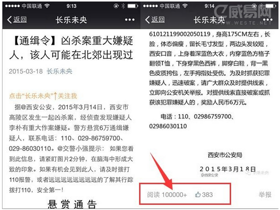在這起“通緝令”傳播事件中,未央?yún)^(qū)網(wǎng)信辦負(fù)責(zé)人介紹說是出于對市民的提醒,維護(hù)社會和諧。在朋友圈瘋狂轉(zhuǎn)發(fā)的市民出于對自身安全權(quán)益的保護(hù),自覺轉(zhuǎn)發(fā)。此時公眾利益與政府訴求是高度一致的?!巴ň兞睢蔽恼略诠俜秸J(rèn)證公號已經(jīng)發(fā)出,似乎坐上了火箭,半日內(nèi)閱讀量極速超過10萬。