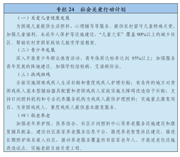 支持殘疾人事業(yè)發(fā)展,建立健全殘疾人基本福利制度,實現(xiàn)殘疾人基本民生兜底保障。完善重度殘疾人醫(yī)療報銷制度。優(yōu)先保障殘疾人基本住房。完善殘疾人就業(yè)創(chuàng)業(yè)扶持政策,健全公共機構(gòu)為殘疾人提供就業(yè)崗位制度。加強殘疾人康復和托養(yǎng)設(shè)施建設(shè),鼓勵社會力量提供服務(wù)。加強殘疾人無障礙設(shè)施建設(shè)和維護。實施0-6歲殘疾兒童康復、貧困殘疾人基本型輔助器具適配等重點康復工程。建設(shè)康復大學,培養(yǎng)康復專業(yè)技術(shù)人才。