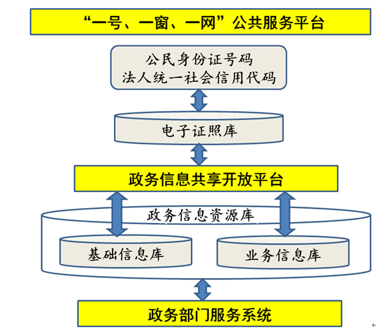“一號、一窗、一網(wǎng)”的信息共享開放業(yè)務(wù)架構(gòu)為:通過統(tǒng)一的公民身份證號、法人統(tǒng)一社會信用代碼和綁定身份證號及法人代碼的實(shí)名電子證照,對接教育服務(wù)、醫(yī)療衛(wèi)生、社會保險、社會福利、社會救助、住房公積金、勞動就業(yè)、婚姻登記、殯葬服務(wù)、住房保障、公共安全等民生服務(wù)領(lǐng)域的政務(wù)信息共享和開放,實(shí)現(xiàn)“一號申請、一窗受理、一網(wǎng)通辦”的政務(wù)服務(wù)。