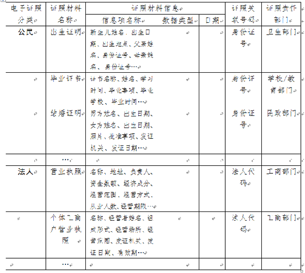 電子證照是指政府部門和取得法定資質(zhì)的第三方服務(wù)機(jī)構(gòu)依法形成出具的具有法律效力的各類批文、證件、執(zhí)(牌)照、鑒定報告、證明材料,以及社會公眾向證照形成單位提交的各種申請文件及相關(guān)證明材料等的電子文件。電子證照主要包括工商營業(yè)執(zhí)照、稅務(wù)登記證等法人使用的證照,出生證、結(jié)婚證、房產(chǎn)證、駕駛證等自然人使用的證照。例如,電子營業(yè)執(zhí)照是根據(jù)國家有關(guān)企業(yè)登記注冊的法律法規(guī),由依法成立的具有認(rèn)證資格的第三方機(jī)構(gòu),以數(shù)字證書為基礎(chǔ),制作載有企業(yè)注冊登記信息的數(shù)字證書,由工商行政管理部門監(jiān)制、核發(fā),是企業(yè)和個體工商戶唯一合法的電子營業(yè)執(zhí)照。