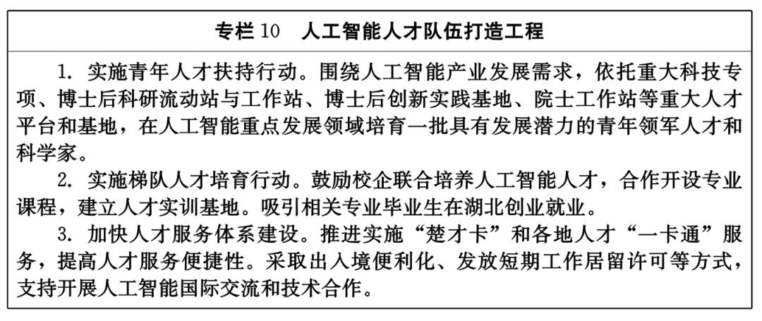 ?。ㄋ模?gòu)建人工智能人才高地。引導(dǎo)和鼓勵(lì)高校設(shè)立人工智能相關(guān)學(xué)科專業(yè),支持高校人工智能學(xué)科建設(shè)。構(gòu)建政產(chǎn)學(xué)研用聯(lián)動(dòng)的人才需求對接和定向培養(yǎng)機(jī)制,依托武漢大學(xué)、華中科技大學(xué)、武漢理工大學(xué)等高校以及中科院測量與地球物理研究所等科研院所科教資源,加大人工智能人才培養(yǎng)力度,構(gòu)建面向產(chǎn)業(yè)發(fā)展前沿的多層次、高質(zhì)量人才團(tuán)隊(duì)。鼓勵(lì)校企合作,在人工智能重點(diǎn)發(fā)展領(lǐng)域培育一批具有發(fā)展?jié)摿Φ那嗄觐I(lǐng)軍人才和科學(xué)家。大力引進(jìn)人工智能基礎(chǔ)理論、關(guān)鍵技術(shù)等領(lǐng)域的高端緊缺人才和高水平創(chuàng)新團(tuán)隊(duì)。支持市場化培訓(xùn)機(jī)構(gòu)、人才繼續(xù)教育實(shí)訓(xùn)基地和高技能人才培養(yǎng)基地等,開展人工智能緊缺急需專業(yè)技術(shù)人才和高技能人才培訓(xùn)。鼓勵(lì)人工智能企業(yè)通過長短期聘用、項(xiàng)目合作、技術(shù)咨詢等柔性引才方式,靈活引進(jìn)高端人才。向入選“楚才引領(lǐng)計(jì)劃”的人工智能領(lǐng)域高端緊缺人才發(fā)放“楚才卡”,提供落戶居留、子女就學(xué)、醫(yī)療保健、安居保障、出入境等“一卡通”專員服務(wù)。發(fā)揮股權(quán)激勵(lì)專項(xiàng)基金、人才發(fā)展基金等作用,留住并激勵(lì)人工智能高端人才。