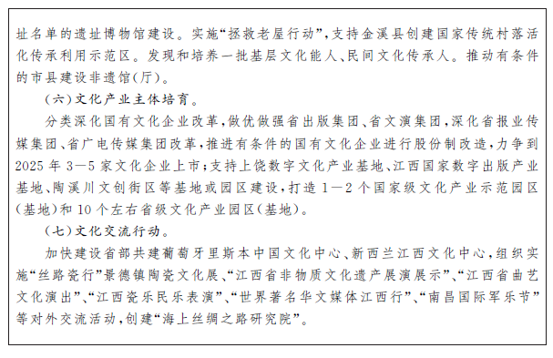 高標(biāo)準(zhǔn)建設(shè)景德鎮(zhèn)國家陶瓷文化傳承創(chuàng)新試驗區(qū),努力打造“兩地一中心”兩地一中心:國家陶瓷文化保護(hù)傳承創(chuàng)新基地、世界著名陶瓷文化旅游目的地、國際陶瓷文化交流合作交易中心。。全面推進(jìn)南昌漢代海昏侯國遺址、景德鎮(zhèn)御窯廠遺址等國家考古遺址公園建設(shè),構(gòu)建更具江西特色的考古遺址公園體系和遺址博物館群。深入開展江西歷史文化專題研究闡釋,推進(jìn)書院文化、稻作文化、戲曲文化、中醫(yī)藥文化、陽明文化等特色歷史文化傳承創(chuàng)新,推動婺源徽州文化、贛南客家文化、景德鎮(zhèn)陶瓷文化、吉安廬陵文化、撫州戲曲文化等文化生態(tài)保護(hù)區(qū)(實驗區(qū))建設(shè)。加強世界文化遺產(chǎn)、重點文物保護(hù)單位、歷史文化名城名鎮(zhèn)名村、傳統(tǒng)村落保護(hù)和利用。強化非物質(zhì)文化遺產(chǎn)系統(tǒng)性保護(hù)。加強優(yōu)秀傳統(tǒng)手工藝保護(hù)和傳承。開展贛鄱文化資源普查,深化古籍整理研究。加強地方志工作。啟動《江右文庫》編纂工程。