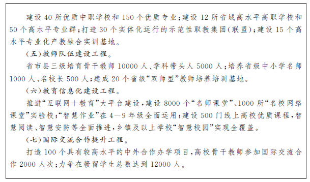 推進(jìn)高等教育分類管理和高等學(xué)校綜合改革,推動高等教育由數(shù)量規(guī)模型向內(nèi)涵質(zhì)量型轉(zhuǎn)變,全面提升人才培養(yǎng)質(zhì)量和科技創(chuàng)新能力。持續(xù)推進(jìn)高等學(xué)?!半p一流”建設(shè),舉全省之力辦好南昌大學(xué),爭取進(jìn)入世界一流大學(xué)建設(shè)高校行列。支持更多特色高校建設(shè)世界一流學(xué)科。優(yōu)化高等教育布局,主動融入國家重大戰(zhàn)略和全省發(fā)展需求,創(chuàng)建若干應(yīng)用型本科院校,引導(dǎo)部分省屬本科院校轉(zhuǎn)型建設(shè)高水平應(yīng)用型高校,加快培養(yǎng)理工農(nóng)醫(yī)類專業(yè)緊缺人才。深化高校省部共建體制機制,加大力度吸引國內(nèi)外知名高校在江西開展合作辦學(xué),爭取更多支持,豐富辦學(xué)資源,擴(kuò)大教育供給。穩(wěn)步擴(kuò)大研究生培養(yǎng)規(guī)模,深化研究生教育改革,提升高層次人才培養(yǎng)質(zhì)量。擴(kuò)大學(xué)校辦學(xué)自主權(quán),推進(jìn)高校建立以章程為核心的制度體系。