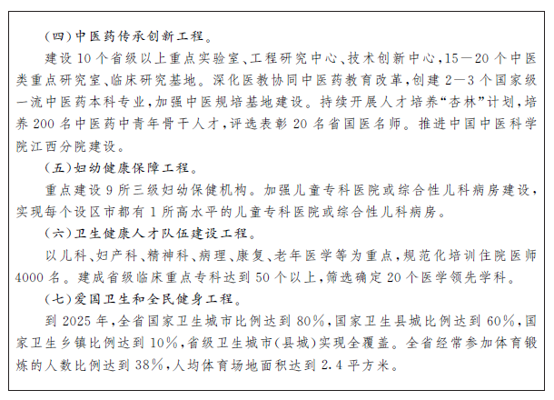 推動優(yōu)質(zhì)醫(yī)療資源擴(kuò)容和區(qū)域均衡布局,積極創(chuàng)建國家區(qū)域醫(yī)療中心,建設(shè)一批省級區(qū)域醫(yī)療中心,整合推進(jìn)卒中、創(chuàng)傷、胸痛、危重孕產(chǎn)婦、危重新生兒救治中心等急危重癥救治體系建設(shè)。以城市社區(qū)和農(nóng)村基層、縣級醫(yī)院和中醫(yī)院為重點,完善城鄉(xiāng)三級醫(yī)療服務(wù)網(wǎng)絡(luò),促進(jìn)“縣鄉(xiāng)一體、鄉(xiāng)村一體”。持續(xù)推進(jìn)省市縣三級公立中醫(yī)院改造升級和基層中醫(yī)藥服務(wù)全覆蓋。加強全科、兒科、麻醉、精神衛(wèi)生、康復(fù)管理、心理健康等急需緊缺專業(yè)人才和公共衛(wèi)生復(fù)合型人才培養(yǎng)培訓(xùn),培養(yǎng)仁心仁術(shù)的醫(yī)學(xué)人才。落實鄉(xiāng)村醫(yī)生待遇,加強基層人才隊伍建設(shè)。加快“互聯(lián)網(wǎng)+醫(yī)療健康”發(fā)展,建成覆蓋省市縣鄉(xiāng)四級醫(yī)療衛(wèi)生機構(gòu)的遠(yuǎn)程醫(yī)療服務(wù)體系。大力推行醫(yī)療機構(gòu)檢查、檢驗結(jié)果互認(rèn),規(guī)范醫(yī)療質(zhì)量控制管理,改善患者就醫(yī)體驗。