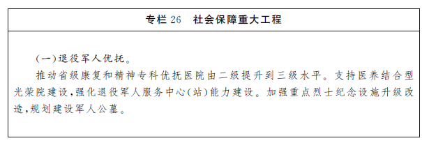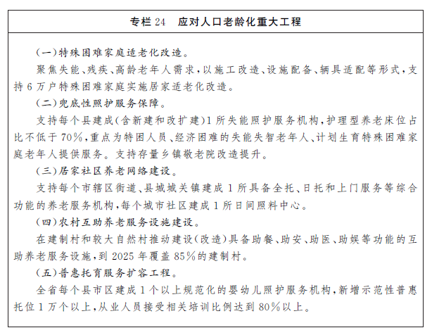 推動養(yǎng)老事業(yè)和養(yǎng)老產(chǎn)業(yè)協(xié)同發(fā)展,發(fā)展普惠型養(yǎng)老服務(wù)和互助性養(yǎng)老,支持家庭承擔(dān)養(yǎng)老功能,構(gòu)建居家社區(qū)機構(gòu)相協(xié)調(diào)、醫(yī)養(yǎng)康養(yǎng)相結(jié)合的養(yǎng)老服務(wù)體系。健全基本養(yǎng)老服務(wù)體系,夯實公辦養(yǎng)老院的兜底功能,深化公辦養(yǎng)老機構(gòu)改革,完善公建民營管理機制,支持具有教育培訓(xùn)或療養(yǎng)休養(yǎng)功能的機構(gòu)轉(zhuǎn)型發(fā)展養(yǎng)老服務(wù),加強對護(hù)理型、連鎖型民辦養(yǎng)老機構(gòu)的政策扶持。推進(jìn)公共基礎(chǔ)設(shè)施適老化改造,支持和規(guī)范專業(yè)化機構(gòu)服務(wù)向社區(qū)延伸,大力發(fā)展社區(qū)嵌入式養(yǎng)老,探索社區(qū)“物業(yè)+養(yǎng)老服務(wù)”模式。深入推進(jìn)醫(yī)養(yǎng)結(jié)合,擴(kuò)大養(yǎng)老機構(gòu)護(hù)理型床位供給。推廣“黨建+農(nóng)村養(yǎng)老服務(wù)”模式,健全覆蓋縣鄉(xiāng)村三級的農(nóng)村養(yǎng)老服務(wù)體系。加快推進(jìn)公辦養(yǎng)老機構(gòu)入住綜合評估和輪候制度,健全養(yǎng)老服務(wù)綜合監(jiān)管制度。強化老年人權(quán)益保障,提升老年人社會優(yōu)待水平。