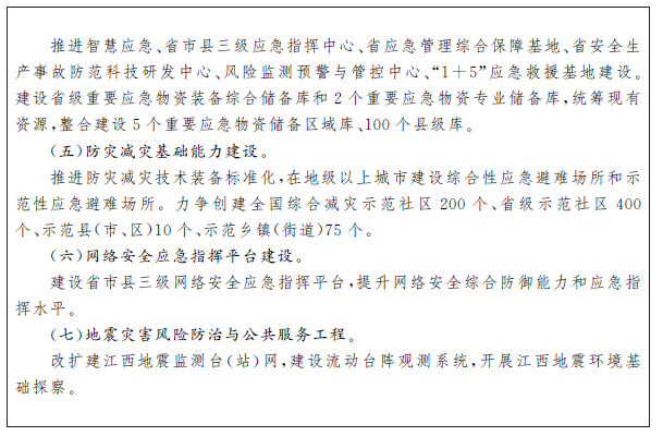 健全完善安全生產(chǎn)責(zé)任和管理制度,加快建立公共安全風(fēng)險排查和隱患治理體系。強化企業(yè)主體責(zé)任落實,加強危險化學(xué)品、煙花爆竹、礦山、建筑施工、交通、消防等重點領(lǐng)域安全生產(chǎn)監(jiān)管執(zhí)法,有效遏制重特大公共安全事故。強化生物安全保障,提高食品藥品等關(guān)系人民健康產(chǎn)品和服務(wù)的安全監(jiān)管水平,強化疫苗等高風(fēng)險品種監(jiān)管。建立高效科學(xué)的自然災(zāi)害防治體系,提升洪澇干旱、森林火災(zāi)、地質(zhì)災(zāi)害、氣象災(zāi)害、地震等自然災(zāi)害防御工程標(biāo)準(zhǔn),推進(jìn)防災(zāi)抗災(zāi)重大基礎(chǔ)設(shè)施建設(shè)。完善應(yīng)急管理體制機制,強化應(yīng)急管理基礎(chǔ)和應(yīng)急救援隊伍建設(shè)。加快構(gòu)建政府、企業(yè)、第三方等多方聯(lián)動的應(yīng)急物資保障體系,合理確定省級儲備和市縣級儲備、政府儲備和企業(yè)儲備、實物儲備和產(chǎn)能儲備規(guī)模,完善物資儲備、動用應(yīng)急預(yù)案。發(fā)展巨災(zāi)保險。