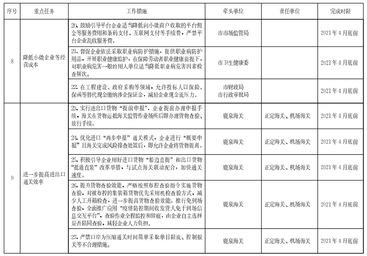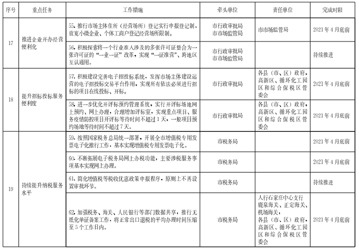 為貫徹落實(shí)《河北省人民政府辦公廳關(guān)于進(jìn)一步優(yōu)化營(yíng)商環(huán)境更好服務(wù)市場(chǎng)主體若干措施》(冀政辦字〔2020〕170號(hào))精神,結(jié)合統(tǒng)籌常態(tài)化疫情防控和經(jīng)濟(jì)社會(huì)發(fā)展要求,更好服務(wù)市場(chǎng)主體,切實(shí)解決企業(yè)生產(chǎn)經(jīng)營(yíng)中的堵點(diǎn)、痛點(diǎn)、難點(diǎn),加快建設(shè)一流營(yíng)商環(huán)境體系,制定如下措施。