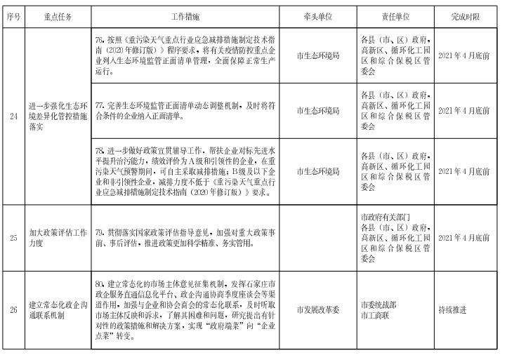 (二十四)進(jìn)一步強(qiáng)化生態(tài)環(huán)境差異化管控措施落實(shí)。按照《重污染天氣重點(diǎn)行業(yè)應(yīng)急減排措施制定技術(shù)指南(2020年修訂版)》程序要求,將有關(guān)疫情防控重點(diǎn)企業(yè)列入生態(tài)環(huán)境監(jiān)管正面清單管理,全面保障正常生產(chǎn)運(yùn)行。完善生態(tài)環(huán)境監(jiān)管正面清單動(dòng)態(tài)調(diào)整機(jī)制,及時(shí)將符合條件的企業(yè)納入正面清單。進(jìn)一步做好政策宣貫輔導(dǎo)工作,幫扶企業(yè)對(duì)標(biāo)先進(jìn)水平提升治污能力,績(jī)效評(píng)價(jià)為A級(jí)和引領(lǐng)性的企業(yè),在重污染天氣預(yù)警期間,可自主采取減排措施;B級(jí)及以下企業(yè)和非引領(lǐng)性企業(yè),減排力度不低于《重污染天氣重點(diǎn)行業(yè)應(yīng)急減排措施制定技術(shù)指南(2020年修訂版)》要求。