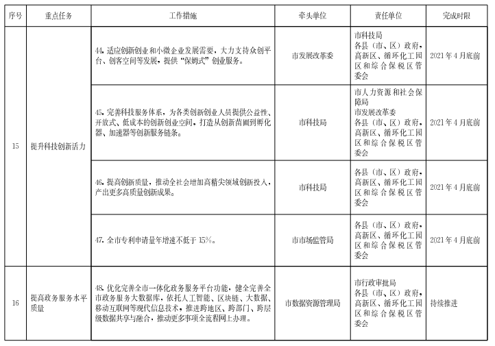 (十五)提升科技創(chuàng)新活力。適應(yīng)創(chuàng)新創(chuàng)業(yè)和小微企業(yè)發(fā)展需要,大力支持眾創(chuàng)平臺(tái)、創(chuàng)客空間等發(fā)展,提供“保姆式”創(chuàng)業(yè)服務(wù)。完善科技服務(wù)體系,為各類創(chuàng)新創(chuàng)業(yè)人員提供公益性、開(kāi)放式、低成本的創(chuàng)新創(chuàng)業(yè)空間,打造從創(chuàng)新苗圃到孵化器、加速器等創(chuàng)新服務(wù)鏈條。提高創(chuàng)新質(zhì)量,推動(dòng)全社會(huì)增加高精尖領(lǐng)域創(chuàng)新投入,產(chǎn)出更多高質(zhì)量創(chuàng)新成果。全市專利申請(qǐng)量年增速不低于15%。