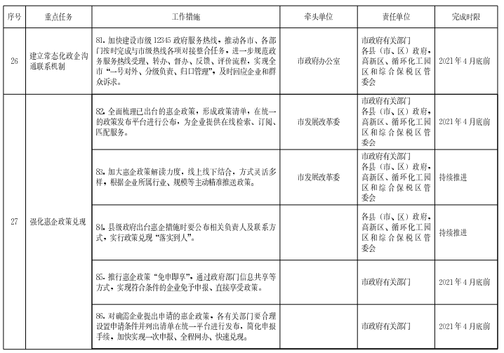 ?。ǘ撸?qiáng)化惠企政策兌現(xiàn)。全面梳理已出臺(tái)的惠企政策,形成政策清單,在統(tǒng)一的政策發(fā)布平臺(tái)進(jìn)行公布,為企業(yè)提供在線檢索、訂閱、匹配服務(wù)。加大惠企政策解讀力度,線上線下結(jié)合,方式靈活多樣,根據(jù)企業(yè)所屬行業(yè)、規(guī)模等主動(dòng)精準(zhǔn)推送政策??h級(jí)政府出臺(tái)惠企措施時(shí)要公布相關(guān)負(fù)責(zé)人及聯(lián)系方式,實(shí)行政策兌現(xiàn)“落實(shí)到人”。推行惠企政策“免申即享”,通過(guò)政府部門信息共享等方式,實(shí)現(xiàn)符合條件的企業(yè)免予申報(bào)、直接享受政策。對(duì)確需企業(yè)提出申請(qǐng)的惠企政策,各有關(guān)部門要合理設(shè)置申請(qǐng)條件并列出清單在統(tǒng)一平臺(tái)進(jìn)行發(fā)布,簡(jiǎn)化申報(bào)手續(xù),加快實(shí)現(xiàn)一次申報(bào)、全程網(wǎng)辦、快速兌現(xiàn)。