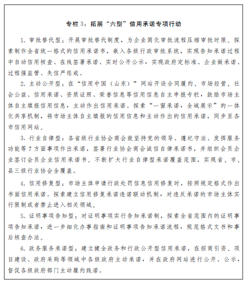 大力推廣應(yīng)用信用承諾制度。推行審批替代、主動(dòng)公開(kāi)、行業(yè)自律、信用修復(fù)、證明事項(xiàng)告知、政務(wù)服務(wù)承諾等“六型”信用承諾制。落實(shí)市場(chǎng)主體自主權(quán)和主體責(zé)任,將書(shū)面承諾的履約情況記入信用記錄,作為事中、事后監(jiān)管的重要依據(jù)。建立違反承諾懲戒機(jī)制,對(duì)虛假承諾、違規(guī)承諾的市場(chǎng)主體依法依規(guī)進(jìn)行處理,并將信息歸集至省公共信用信息平臺(tái),通過(guò)“信用中國(guó)(山東)”網(wǎng)站進(jìn)行集中曝光。探索開(kāi)展市場(chǎng)準(zhǔn)入承諾,鼓勵(lì)市場(chǎng)主體在進(jìn)入市場(chǎng)前主動(dòng)向社會(huì)作出信用承諾。發(fā)揮行業(yè)協(xié)會(huì)的自律作用,推動(dòng)各級(jí)行業(yè)協(xié)會(huì)和會(huì)員企業(yè)作出守信承諾,主動(dòng)接受行業(yè)和社會(huì)監(jiān)督。