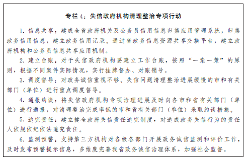 健全政府守信踐諾機(jī)制。將守信踐諾情況納入政務(wù)信用記錄,推動(dòng)各級(jí)各部門(mén)樹(shù)立誠(chéng)信意識(shí)和提高誠(chéng)信水平。持續(xù)開(kāi)展失信政府機(jī)構(gòu)清理整治專項(xiàng)行動(dòng),聚焦“新官不理舊賬”等突出問(wèn)題,采取有力措施,徹底清理存量,嚴(yán)防發(fā)生增量,對(duì)失信政府機(jī)構(gòu)“零容忍”。