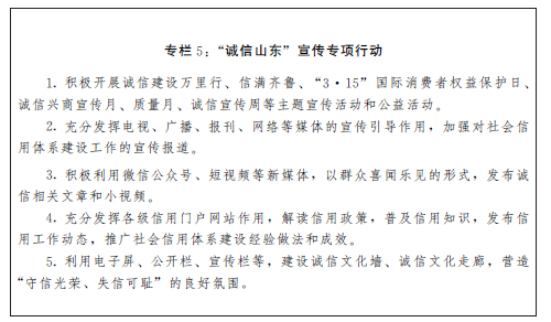 (九)大力弘揚(yáng)誠(chéng)信文化,打響“誠(chéng)信山東”品牌。加大誠(chéng)信教育和宣傳工作力度,采取正面宣傳與輿論監(jiān)督相結(jié)合的方式,打造不敢失信、不能失信、不愿失信的社會(huì)環(huán)境,為全省經(jīng)濟(jì)社會(huì)發(fā)展提供道德支撐和信用保障。