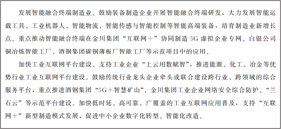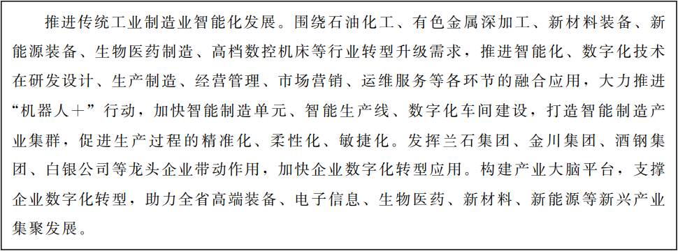 圍繞沿黃河流域、河西走廊、隴東南三大產(chǎn)業(yè)聚集帶的空間布局,聚焦石化、能源、冶金、裝備制造等重點行業(yè),打造智能制造產(chǎn)業(yè)集群,全面提升企業(yè)數(shù)字化水平,形成智能制造為驅(qū)動的新型工業(yè)體系。
