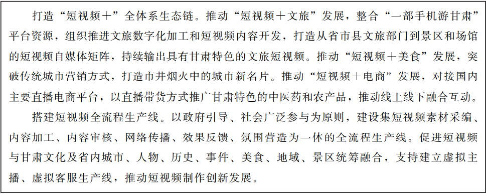 充分挖掘甘肅厚重的歷史文化旅游資源,在文化、旅游、民俗、美食、電商等領(lǐng)域與5G、短視頻、音頻、虛擬現(xiàn)實、在線直播等新技術(shù)業(yè)態(tài)相結(jié)合,引入短視頻服務(wù)類、音頻服務(wù)類、云服務(wù)類、電商類企業(yè),以數(shù)字內(nèi)容生產(chǎn)為抓手,打造“線上引流、線下轉(zhuǎn)型”的發(fā)展新模式,實現(xiàn)“一業(yè)帶百業(yè)”。