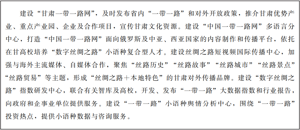 推進(jìn)海外數(shù)據(jù)在甘肅匯集、分析、落地應(yīng)用,加強同“一帶一路”沿線國家在數(shù)字化、網(wǎng)絡(luò)化、智能化方面的國際合作,促進(jìn)文化國際傳播交流,打造“數(shù)字絲綢之路”的重要門戶和核心節(jié)點。