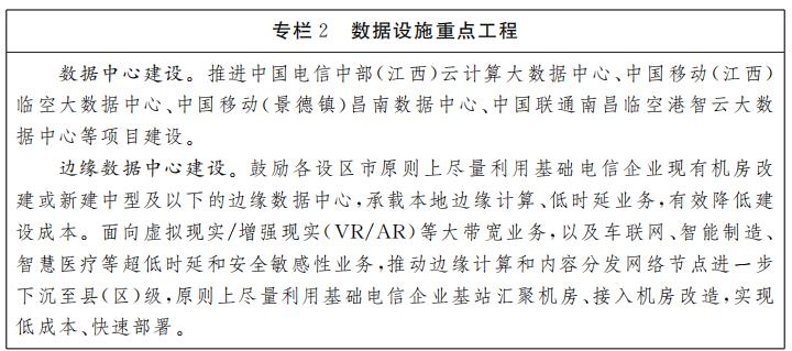 圍繞網(wǎng)絡(luò)設(shè)施、數(shù)據(jù)設(shè)施、智能設(shè)施、創(chuàng)新設(shè)施,強(qiáng)化重大項(xiàng)目的牽引與帶動(dòng)作用,積極布局?jǐn)?shù)據(jù)中心、國(guó)家級(jí)互聯(lián)網(wǎng)骨干直聯(lián)點(diǎn)、國(guó)際互聯(lián)網(wǎng)數(shù)據(jù)專用通道、工業(yè)互聯(lián)網(wǎng)標(biāo)識(shí)解析二級(jí)節(jié)點(diǎn)以及AI、區(qū)塊鏈、物聯(lián)網(wǎng)、VR規(guī)模應(yīng)用等一批重大項(xiàng)目,完善全省科創(chuàng)城布局,打造中部地區(qū)領(lǐng)先的新型基礎(chǔ)設(shè)施體系,筑牢數(shù)字江西建設(shè)底座。
