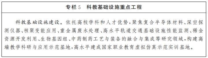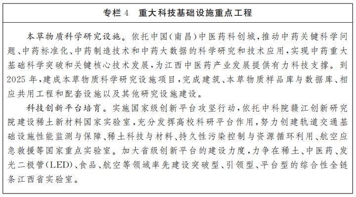 布局大科學(xué)裝置。立足江西資源稟賦和特色產(chǎn)業(yè),以前瞻性、戰(zhàn)略性、整體性眼光,聚焦生物醫(yī)藥、新材料、發(fā)酵工程、航空、射電望遠(yuǎn)鏡等領(lǐng)域,積極爭(zhēng)取國(guó)家支持,謀劃建設(shè)國(guó)家重大科技基礎(chǔ)設(shè)施。重點(diǎn)以中醫(yī)藥科創(chuàng)城為載體,加快推進(jìn)本草物質(zhì)科學(xué)研究設(shè)施項(xiàng)目建設(shè)。
