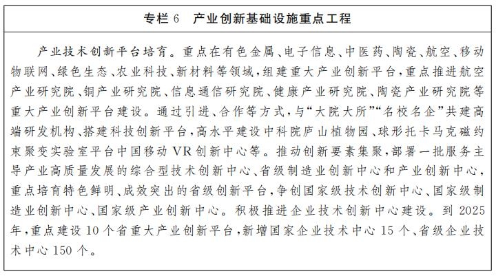 ——?jiǎng)?chuàng)新設(shè)施加速創(chuàng)新資源集聚。建成以國(guó)家級(jí)平臺(tái)為龍頭、省級(jí)平臺(tái)為骨干、市級(jí)平臺(tái)為支撐的三級(jí)創(chuàng)新平臺(tái)體系,綜合科技創(chuàng)新水平達(dá)到全國(guó)中上游水平。物聯(lián)網(wǎng)、VR、稀土、中醫(yī)藥、大數(shù)據(jù)產(chǎn)業(yè)創(chuàng)新能力邁入國(guó)內(nèi)一流水平。