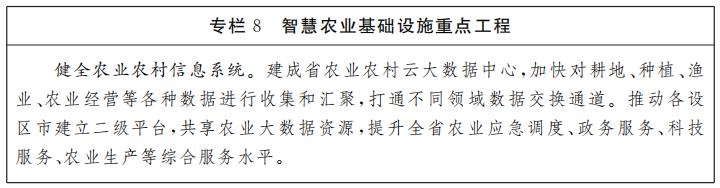 智慧農(nóng)業(yè)基礎(chǔ)設(shè)施建設(shè)。健全農(nóng)業(yè)農(nóng)村信息系統(tǒng),搭建農(nóng)業(yè)產(chǎn)業(yè)鏈大數(shù)據(jù)公共服務(wù)平臺(tái),加快全省農(nóng)業(yè)農(nóng)村數(shù)據(jù)向省農(nóng)業(yè)農(nóng)村云大數(shù)據(jù)中心匯集,全面提升涉農(nóng)數(shù)據(jù)采集、監(jiān)測(cè)、分析、決策支撐能力。建立重大建設(shè)項(xiàng)目占用永久基本農(nóng)田補(bǔ)劃情況及永久基本農(nóng)田儲(chǔ)備區(qū)數(shù)據(jù)庫(kù)。加快農(nóng)業(yè)生產(chǎn)環(huán)節(jié)數(shù)字化改造,推進(jìn)智慧農(nóng)場(chǎng)、智慧牧場(chǎng)、智慧漁場(chǎng)建設(shè),實(shí)施農(nóng)業(yè)物聯(lián)網(wǎng)示范工程,加快5G、物聯(lián)網(wǎng)、AI等技術(shù)以及無(wú)人機(jī)、農(nóng)業(yè)機(jī)器人等在種植業(yè)、畜牧業(yè)、漁業(yè)領(lǐng)域應(yīng)用推廣,實(shí)現(xiàn)農(nóng)業(yè)生產(chǎn)全面感知化、無(wú)人作業(yè)化、管理精細(xì)化,助力鄉(xiāng)村振興戰(zhàn)略實(shí)施。推進(jìn)中醫(yī)藥種植養(yǎng)殖數(shù)字化、智能化發(fā)展,打造一批全國(guó)領(lǐng)先的智慧種養(yǎng)基地,助力國(guó)家中醫(yī)藥綜合改革示范區(qū)和中醫(yī)藥強(qiáng)省建設(shè)。利用大數(shù)據(jù)技術(shù)對(duì)農(nóng)產(chǎn)品進(jìn)行全生命周期閉環(huán)管理,加快全省農(nóng)業(yè)投入品電子追溯和農(nóng)副產(chǎn)品質(zhì)量安全追溯平臺(tái)建設(shè),創(chuàng)新農(nóng)產(chǎn)品產(chǎn)銷銜接服務(wù)模式,推動(dòng)農(nóng)產(chǎn)品從田間到餐桌無(wú)縫銜接。