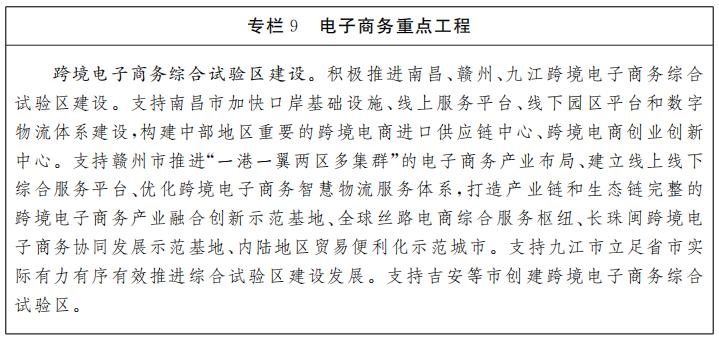 電子商務(wù)平臺(tái)建設(shè)。提升電子商務(wù)面向工業(yè)和農(nóng)業(yè)的服務(wù)能力。推進(jìn)重點(diǎn)產(chǎn)業(yè)與電子商務(wù)深度融合,加快工業(yè)電子商務(wù)平臺(tái)普及應(yīng)用,支持重點(diǎn)行業(yè)領(lǐng)軍企業(yè)建設(shè)一批專業(yè)性、特色化工業(yè)電子商務(wù)平臺(tái),加強(qiáng)電子商務(wù)平臺(tái)與工業(yè)生產(chǎn)數(shù)據(jù)對(duì)接。探索以產(chǎn)業(yè)融合為主要特色的內(nèi)陸地區(qū)跨境電子商務(wù)發(fā)展新模式,推進(jìn)跨境電子商務(wù)綜合試驗(yàn)區(qū)建設(shè),加快構(gòu)建跨境電子商務(wù)綜合服務(wù)平臺(tái)。深入推進(jìn)電子商務(wù)平臺(tái)向農(nóng)村延伸,實(shí)施“互聯(lián)網(wǎng)+”農(nóng)產(chǎn)品出村進(jìn)城工程,助力江西茶葉、贛南臍橙、南豐蜜楠、鄱陽(yáng)湖水產(chǎn)、高山油茶等名優(yōu)特色農(nóng)產(chǎn)品出村進(jìn)城,推進(jìn)電子商務(wù)平臺(tái)與物流配送設(shè)施協(xié)同部署。實(shí)施“贛品網(wǎng)上行”,打造一批特色電商小鎮(zhèn)(村)、淘寶村(鎮(zhèn)),鼓勵(lì)有序發(fā)展農(nóng)村電商直播和基地直采等新模式,多方拓寬農(nóng)產(chǎn)品銷售渠道。支持發(fā)展平臺(tái)經(jīng)濟(jì)、網(wǎng)紅經(jīng)濟(jì)、直播經(jīng)濟(jì)、社交電商等電子商務(wù)新業(yè)態(tài),培育一批數(shù)字商務(wù)企業(yè)。
