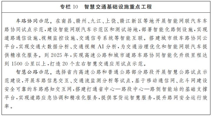 智慧交通基礎(chǔ)設(shè)施建設(shè)。推動(dòng)全省交通大數(shù)據(jù)中心建設(shè),整合公路、鐵路、水路、民航等各類交通數(shù)據(jù),探索建設(shè)多式聯(lián)運(yùn)綜合運(yùn)輸服務(wù)平臺(tái)體系。支持各設(shè)區(qū)市建設(shè)城市交通大腦,強(qiáng)化交通大數(shù)據(jù)分析、交通視頻AI分析等能力,建設(shè)標(biāo)準(zhǔn)統(tǒng)一、開(kāi)放共享的智能網(wǎng)聯(lián)汽車大數(shù)據(jù)基礎(chǔ)平臺(tái)。推進(jìn)智慧道路基礎(chǔ)設(shè)施建設(shè),加強(qiáng)車用無(wú)線通信網(wǎng)絡(luò)(LTE-V2X)覆蓋,推進(jìn)新一代車用無(wú)線通信網(wǎng)絡(luò)(5G-V2X)在部分城市道路、高速公路重點(diǎn)路段試點(diǎn)示范。分區(qū)域開(kāi)展景區(qū)、園區(qū)、港口等重點(diǎn)區(qū)域城市道路設(shè)施智能化改造,統(tǒng)籌部署高清攝像頭、激光雷達(dá)、毫米波雷達(dá)、智能交通信號(hào)燈、基于蜂窩車聯(lián)網(wǎng)(C-V2X)的路側(cè)單元等智能設(shè)備。在南昌、贛州、九江、上饒、贛江新區(qū)等地建設(shè)自動(dòng)駕駛測(cè)試道路場(chǎng)景,高標(biāo)準(zhǔn)建設(shè)昌九高速智慧高速公路試點(diǎn)項(xiàng)目,打造江西智慧高速公路標(biāo)桿和國(guó)內(nèi)綜合性智能駕駛創(chuàng)新示范樣板。支持已有軌道交通的設(shè)區(qū)市建設(shè)地鐵大數(shù)據(jù)平臺(tái),加快基于人臉識(shí)別技術(shù)的智慧安檢設(shè)施建設(shè),探索開(kāi)展基于5G網(wǎng)絡(luò)的軌道交通車載視頻和監(jiān)測(cè)數(shù)據(jù)回傳應(yīng)用。推進(jìn)南昌昌北國(guó)際機(jī)場(chǎng)等設(shè)施智能化升級(jí),完善高清視頻監(jiān)控、AR智能眼鏡等智能設(shè)施部署。加快內(nèi)河水運(yùn)數(shù)字化改造,提升港口集裝箱裝卸、理貨等智能化水平。