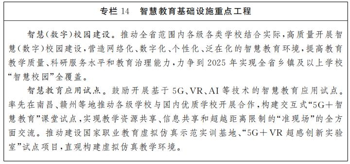 智慧教育基礎(chǔ)設(shè)施建設(shè)。優(yōu)化升級(jí)學(xué)校網(wǎng)絡(luò)接入和帶寬條件,推動(dòng)5G網(wǎng)絡(luò)校園覆蓋。推進(jìn)各級(jí)各類學(xué)校智慧校園建設(shè),充分利用“5G+VR”等技術(shù)建設(shè)智慧教室、智慧實(shí)驗(yàn)室、全息課堂等具有實(shí)踐性和互動(dòng)性的學(xué)科教室,加快建設(shè)在線智能教室、虛擬工廠、數(shù)字圖書(shū)館等智能學(xué)習(xí)空間,形成泛在化、智能化學(xué)習(xí)體系。加強(qiáng)職業(yè)院校、高校虛擬仿真實(shí)訓(xùn)教學(xué)環(huán)境建設(shè),打造一批融合仿真技術(shù)、體感技術(shù)等新技術(shù)的職業(yè)教育信息化實(shí)訓(xùn)基地,提升職業(yè)學(xué)校教學(xué)水平。推動(dòng)各類學(xué)校接入江西省教育資源公共服務(wù)平臺(tái)“贛教云”,推進(jìn)“互聯(lián)網(wǎng)+教育”大平臺(tái)建設(shè),建設(shè)江西省“名師課堂”“名校網(wǎng)絡(luò)課堂”,普及“智慧作業(yè)”在高年級(jí)應(yīng)用,擴(kuò)大優(yōu)質(zhì)教育資源覆蓋范圍,實(shí)現(xiàn)“優(yōu)質(zhì)資源班班通”。探索發(fā)展數(shù)字化、在線化老年大學(xué)、學(xué)歷教育、社會(huì)培訓(xùn)等特色教育,推動(dòng)其他數(shù)字校園資源向特色教育機(jī)構(gòu)開(kāi)放。
