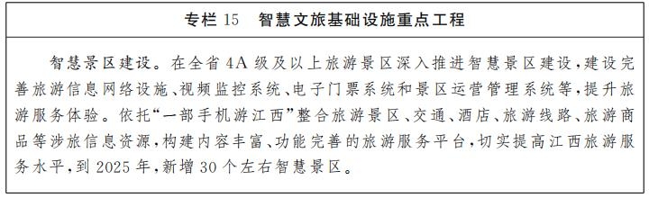 智慧文旅基礎(chǔ)設(shè)施建設(shè)。推進(jìn)“一部手機(jī)游江西”建設(shè),依托全省智慧旅游大數(shù)據(jù)中心,橫向融合交通、商務(wù)、市場(chǎng)監(jiān)管、民航、鐵路、氣象等部門涉旅數(shù)據(jù),縱向歸集省市縣及景區(qū)涉旅數(shù)據(jù),建成綜合性旅游智慧平臺(tái)。完善“云游江西”旅游推廣平臺(tái)并接入“贛服通”,將其打造成江西旅游宣傳推廣的官方助手。推進(jìn)4A級(jí)及以上旅游景區(qū)智慧化建設(shè),實(shí)現(xiàn)智能導(dǎo)游、電子講解、智能找?guī)?、智慧停車等功能全覆蓋。推動(dòng)各級(jí)各類公共文化服務(wù)場(chǎng)館寬帶網(wǎng)絡(luò)全覆蓋,推進(jìn)數(shù)字圖書(shū)館、數(shù)字文化館、數(shù)字博物館和數(shù)字非物質(zhì)文化遺產(chǎn)等智慧場(chǎng)館建設(shè),提升公共數(shù)字文化服務(wù)水平。加快實(shí)現(xiàn)4A級(jí)及以上景區(qū)、重點(diǎn)公共文化服務(wù)場(chǎng)所5G信號(hào)全覆蓋。推動(dòng)文化和旅游服務(wù)應(yīng)用場(chǎng)景智能化設(shè)施部署,運(yùn)用人機(jī)交互、VR/AR、全息等技術(shù)打造交互式文化體驗(yàn)專區(qū),增強(qiáng)公共文化服務(wù)互動(dòng)性和趣味性。