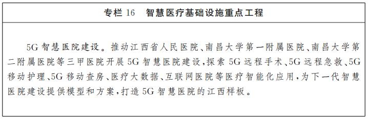 智慧醫(yī)療基礎(chǔ)設(shè)施建設(shè)。完善區(qū)域全民健康信息平臺(tái),加強(qiáng)全民健康信息化互聯(lián)互通,促進(jìn)數(shù)據(jù)共享和業(yè)務(wù)協(xié)同。完善城鄉(xiāng)三級(jí)醫(yī)療服務(wù)網(wǎng)絡(luò),促進(jìn)“縣鄉(xiāng)一體、鄉(xiāng)村一體”。推動(dòng)醫(yī)療機(jī)構(gòu)接入省級(jí)遠(yuǎn)程醫(yī)療服務(wù)平臺(tái),構(gòu)建省市縣鄉(xiāng)四級(jí)遠(yuǎn)程醫(yī)療服務(wù)體系。促進(jìn)省域內(nèi)優(yōu)質(zhì)醫(yī)療資源擴(kuò)容和均衡布局,推進(jìn)省級(jí)區(qū)域醫(yī)療中心建設(shè)。鼓勵(lì)有條件的公立醫(yī)院、醫(yī)聯(lián)體建設(shè)互聯(lián)網(wǎng)醫(yī)院,重點(diǎn)打造省級(jí)、設(shè)區(qū)市級(jí)互聯(lián)網(wǎng)醫(yī)院。鼓勵(lì)醫(yī)院加快院內(nèi)系統(tǒng)上云和集成整合,構(gòu)建集醫(yī)療、服務(wù)、管理“三位一體”的智慧醫(yī)院系統(tǒng)。創(chuàng)新“5G+醫(yī)療”“VR+醫(yī)療”等新模式應(yīng)用,加快電子健康碼應(yīng)用,鼓勵(lì)各地開(kāi)展AI輔助診療平臺(tái)和智能醫(yī)療影像云建設(shè),推進(jìn)江西特色智慧醫(yī)療建設(shè)。