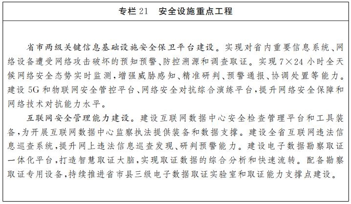 持續(xù)加強(qiáng)網(wǎng)絡(luò)安全保障能力。切實(shí)強(qiáng)化關(guān)鍵信息基礎(chǔ)設(shè)施保護(hù)力度和網(wǎng)絡(luò)空間治理管控能力,落實(shí)網(wǎng)絡(luò)安全等級(jí)保護(hù)制度和關(guān)鍵信息基礎(chǔ)設(shè)施安全保護(hù)制度,對(duì)重要系統(tǒng)和數(shù)據(jù)庫(kù)進(jìn)行容災(zāi)備份,采用防火墻、加密認(rèn)證等措施保障信息基礎(chǔ)設(shè)施免受干擾、破壞或者未經(jīng)授權(quán)的訪問(wèn)。提升互聯(lián)網(wǎng)違法信息監(jiān)測(cè)研判能力,有效預(yù)防網(wǎng)絡(luò)違法信息風(fēng)險(xiǎn)。在5G、寬帶網(wǎng)絡(luò)、物聯(lián)網(wǎng)、工業(yè)互聯(lián)網(wǎng)、數(shù)據(jù)中心等設(shè)施建設(shè)過(guò)程中,同步規(guī)劃、建設(shè)、運(yùn)行網(wǎng)絡(luò)安全保護(hù)系統(tǒng),保障設(shè)施的安全可靠性。綜合利用AI、大數(shù)據(jù)、物聯(lián)網(wǎng)智能感知、軟件定義安全、安全虛擬化等新技術(shù),建設(shè)全省網(wǎng)絡(luò)安全態(tài)勢(shì)感知和網(wǎng)絡(luò)安全監(jiān)測(cè)系統(tǒng)、攻擊溯源和智能阻斷系統(tǒng)、網(wǎng)絡(luò)安全攻防演練平臺(tái)、面向泛在全連接應(yīng)用場(chǎng)景的智能安全防御系統(tǒng)等,構(gòu)建全方位全覆蓋安全防護(hù)體系,提升監(jiān)測(cè)預(yù)警和處置應(yīng)對(duì)能力。推動(dòng)單點(diǎn)式安全防護(hù)向規(guī)?;雷o(hù)轉(zhuǎn)型,建設(shè)形成覆蓋終端、網(wǎng)絡(luò)、云、數(shù)據(jù)和應(yīng)用的多層級(jí)縱深防御、安全威脅精準(zhǔn)識(shí)別和高效聯(lián)動(dòng)的安全服務(wù)能力。