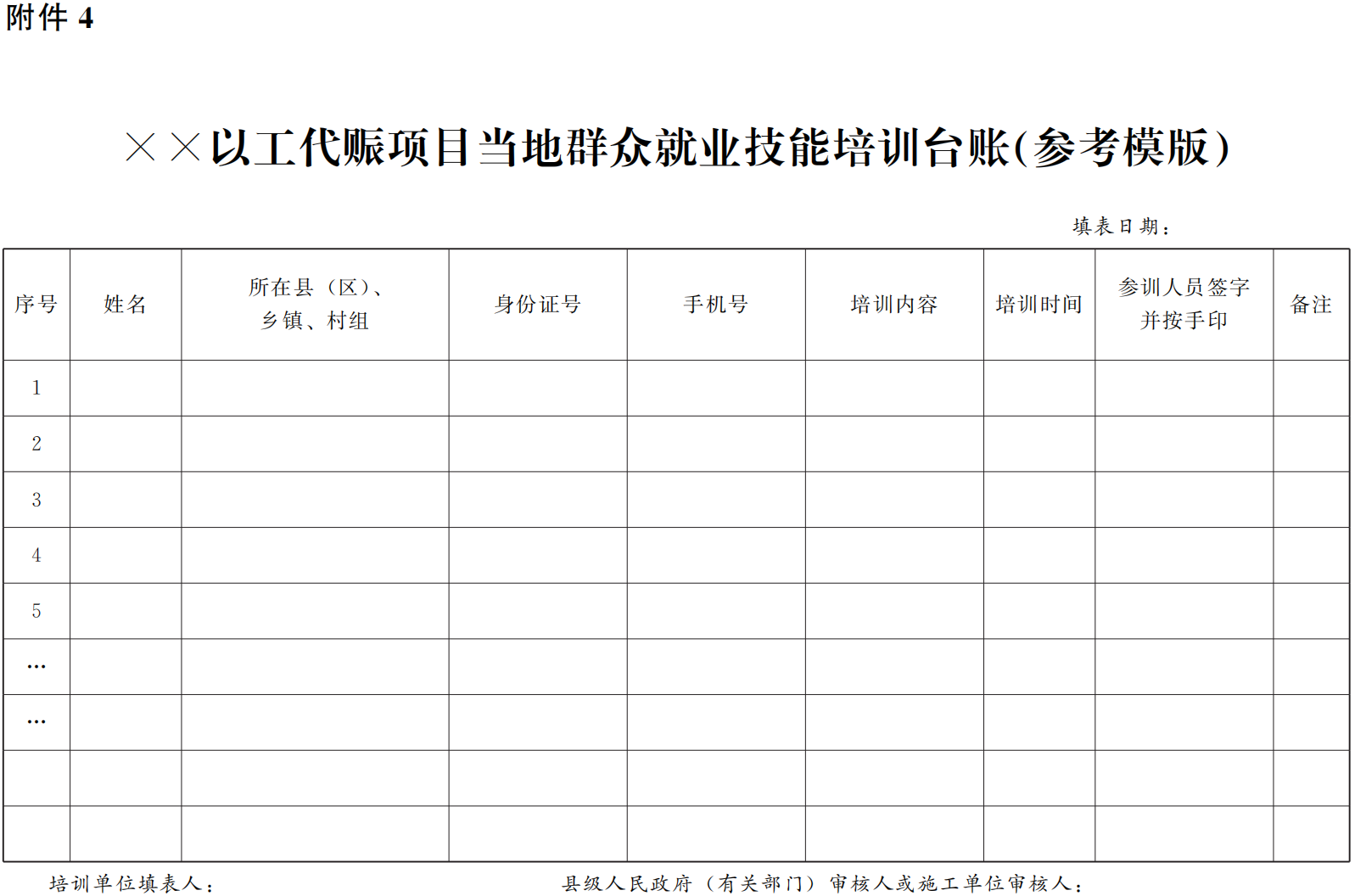 4.××以工代賑項目當?shù)厝罕娋蜆I(yè)技能培訓臺賬(參考模版)