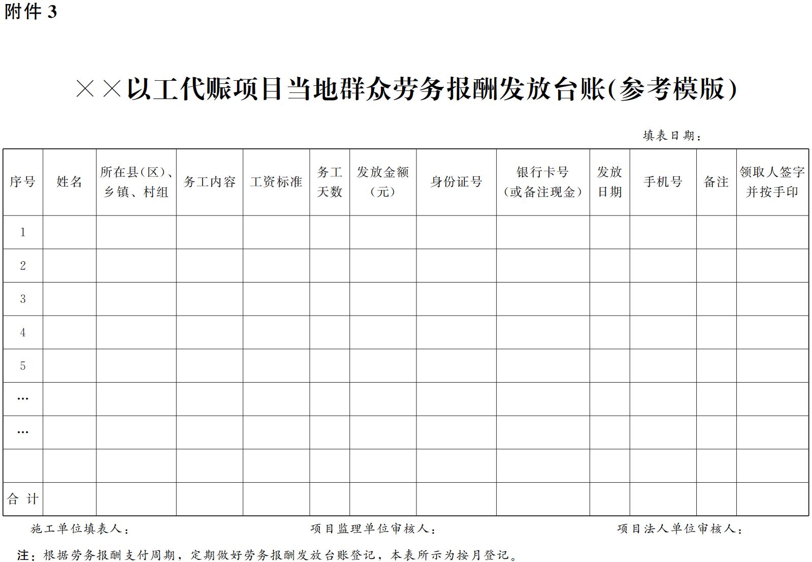3.××以工代賑項目當?shù)厝罕妱趧請蟪臧l(fā)放臺賬(參考模版)