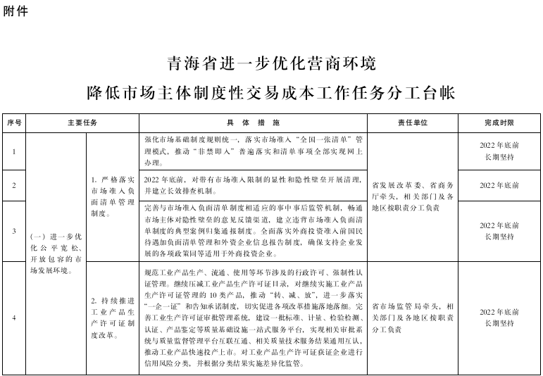 附件:青海省進(jìn)一步優(yōu)化營(yíng)商環(huán)境降低市場(chǎng)主體制度性交易成本工作任務(wù)分工臺(tái)帳