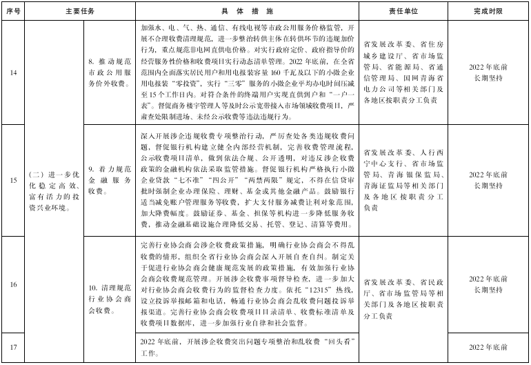 (八)推動(dòng)規(guī)范市政公用服務(wù)價(jià)外收費(fèi)。加強(qiáng)水、電、氣、熱、通信、有線電視等市政公用服務(wù)價(jià)格監(jiān)管,開(kāi)展不合理收費(fèi)清理規(guī)范,進(jìn)一步整治轉(zhuǎn)供主體在轉(zhuǎn)供環(huán)節(jié)的違規(guī)加價(jià)行為,重點(diǎn)規(guī)范非電網(wǎng)直供電價(jià)格。對(duì)實(shí)行政府定價(jià)、政府指導(dǎo)價(jià)的經(jīng)營(yíng)服務(wù)性價(jià)格和收費(fèi)項(xiàng)目實(shí)行動(dòng)態(tài)清單管理。2022年底前,在全省范圍內(nèi)全面落實(shí)居民用戶和用電報(bào)裝容量160千瓦及以下的小微企業(yè)用電報(bào)裝“零投資”,實(shí)行“三零”服務(wù)的小微企業(yè)平均辦電時(shí)間壓減至15個(gè)工作日內(nèi)。對(duì)符合條件的終端用戶實(shí)現(xiàn)直供到戶和“一戶一表”。督促商務(wù)樓宇管理人等及時(shí)公示寬帶接入市場(chǎng)領(lǐng)域收費(fèi)項(xiàng)目,嚴(yán)肅查處限制進(jìn)場(chǎng)、未經(jīng)公示收費(fèi)等違法違規(guī)行為。(省發(fā)展改革委、省住房城鄉(xiāng)建設(shè)廳、省市場(chǎng)監(jiān)管局、省能源局、省通信管理局、國(guó)網(wǎng)青海省電力公司等相關(guān)部門(mén)及各地區(qū)按職責(zé)分工負(fù)責(zé))